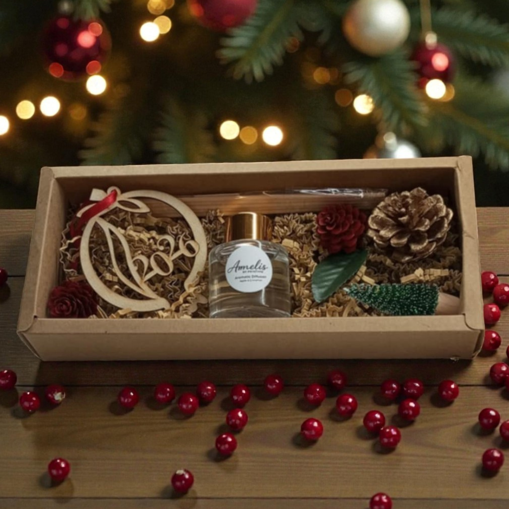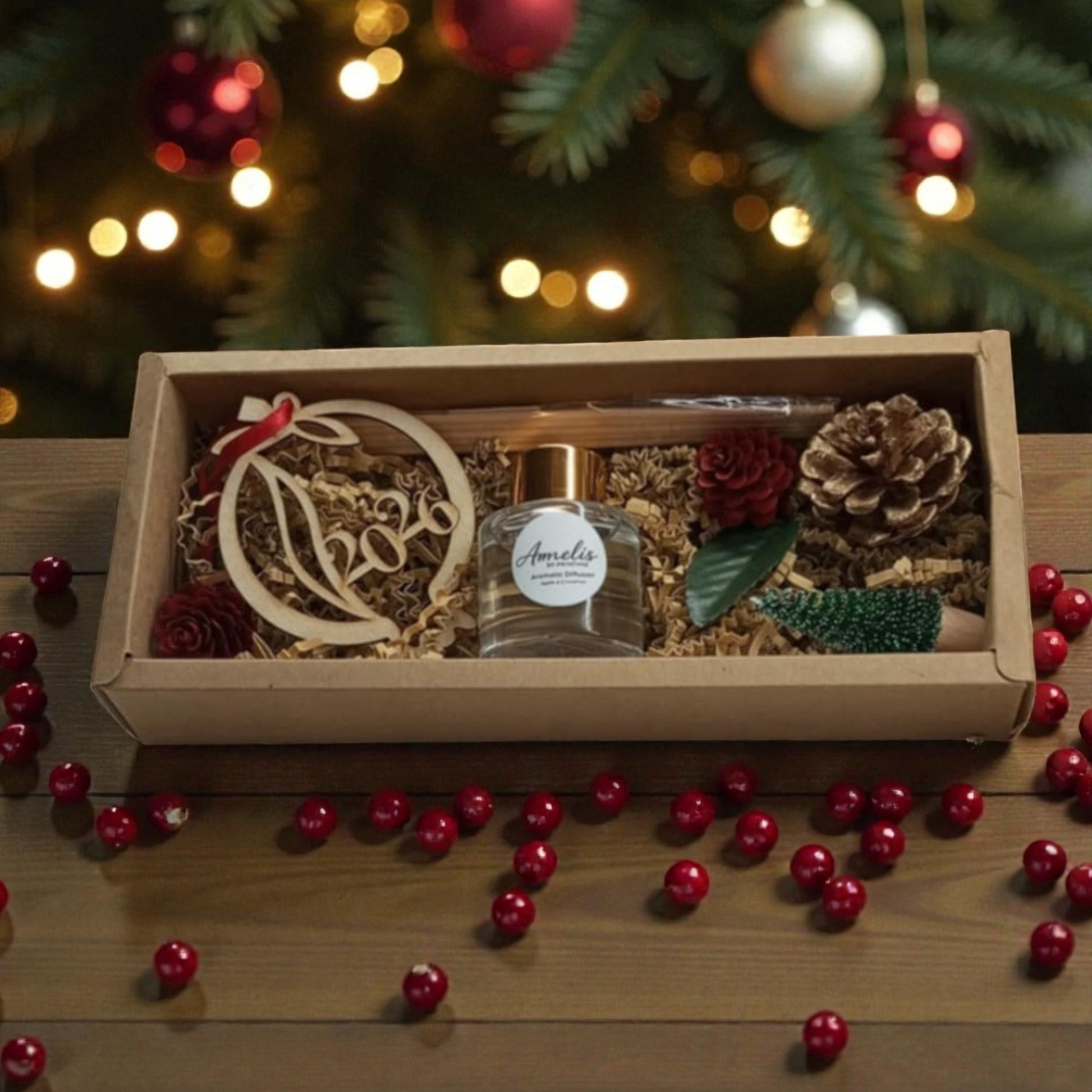 Ένα κομψό χειροποίητο gift set της σειράς Amelis by Printimo, ιδανικό για να αρωματίσει και να στολίσει κάθε χώρο με γιορτινή διάθεση. Ο φυσικός diffuser σε συνδυασμό με το ξύλινο γούρι και τα διακοσμητικά στοιχεία δημιουργούν ένα ολοκληρωμένο δώρο για τις γιορτές.