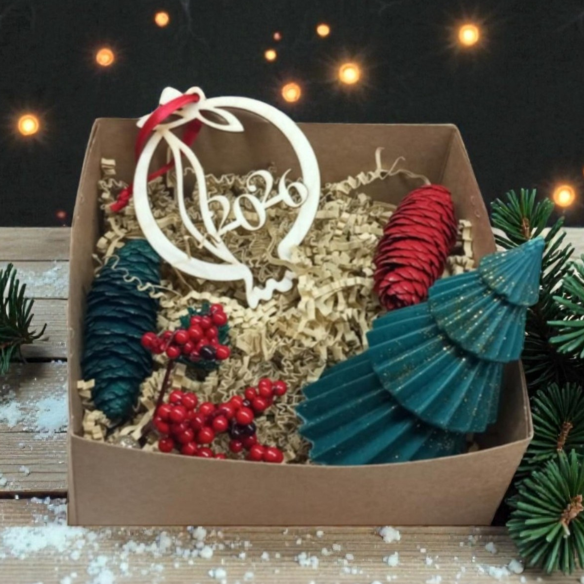 Ένα εντυπωσιακό γιορτινό σετ της σειράς Amelis by Printimo, σχεδιασμένο για να χαρίσει ζεστασιά, άρωμα και χριστουγεννιάτικη λάμψη σε κάθε χώρο. Το χειροποίητο κερί-δέντρο και το ξύλινο γούρι “2026” συνδυάζονται με φυσικά festive στοιχεία, δημιουργώντας ένα ξεχωριστό δώρο έτοιμο για προσφορά.
