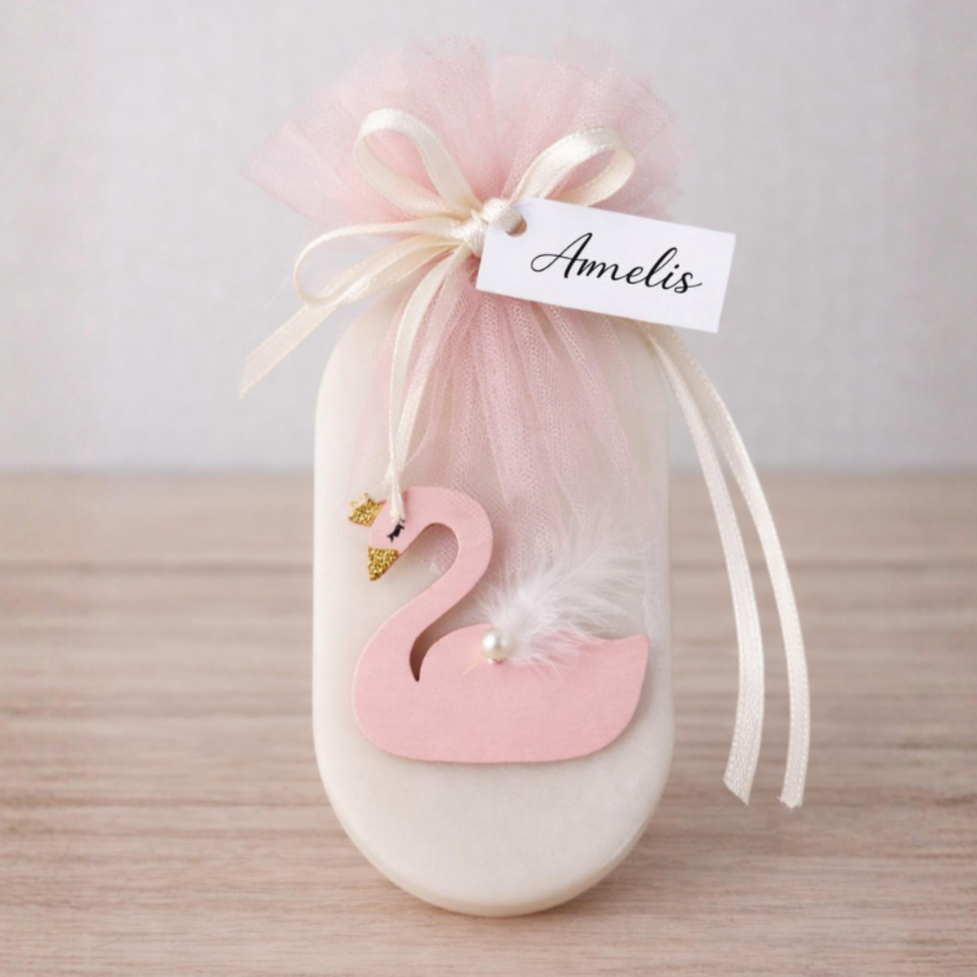 Η συσκευασία με τούλι, σατέν κορδέλα και καρτελάκι Amelis ολοκληρώνει ένα elegant αναμνηστικό, ιδανικό για βάπτιση κοριτσιού, baby shower ή ρομαντικό concept.