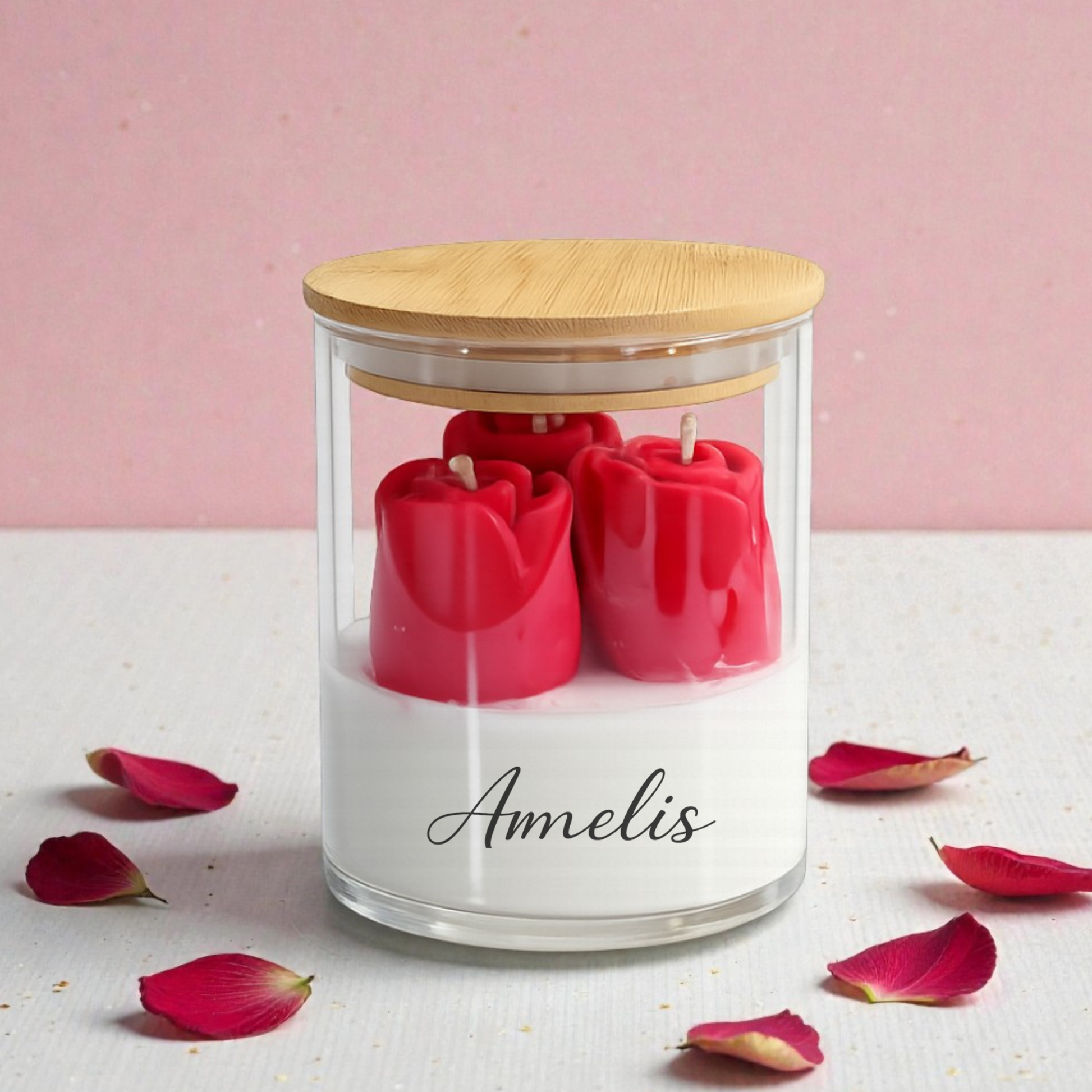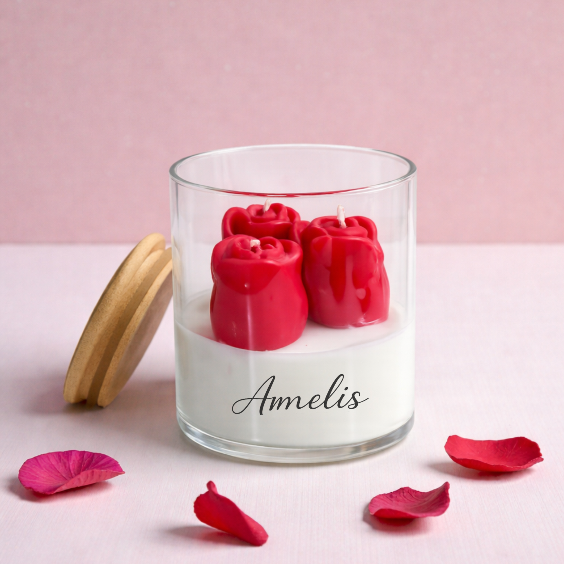 Ρομαντικό αρωματικό κερί σόγιας Amelis σε γυάλινο δοχείο με ξύλινο καπάκι, διακοσμημένο με τρία κόκκινα τριαντάφυλλα-κεριά στην επιφάνεια.