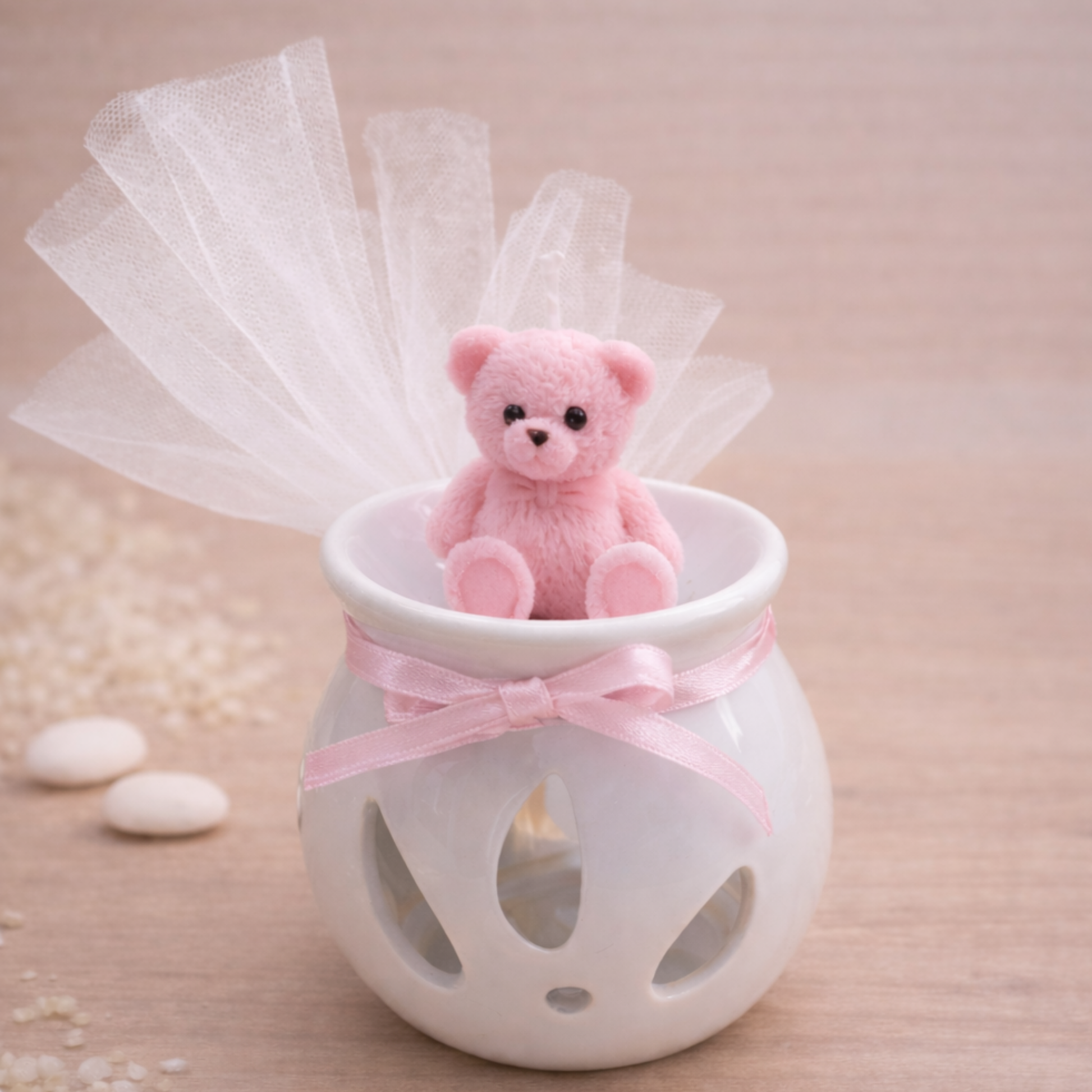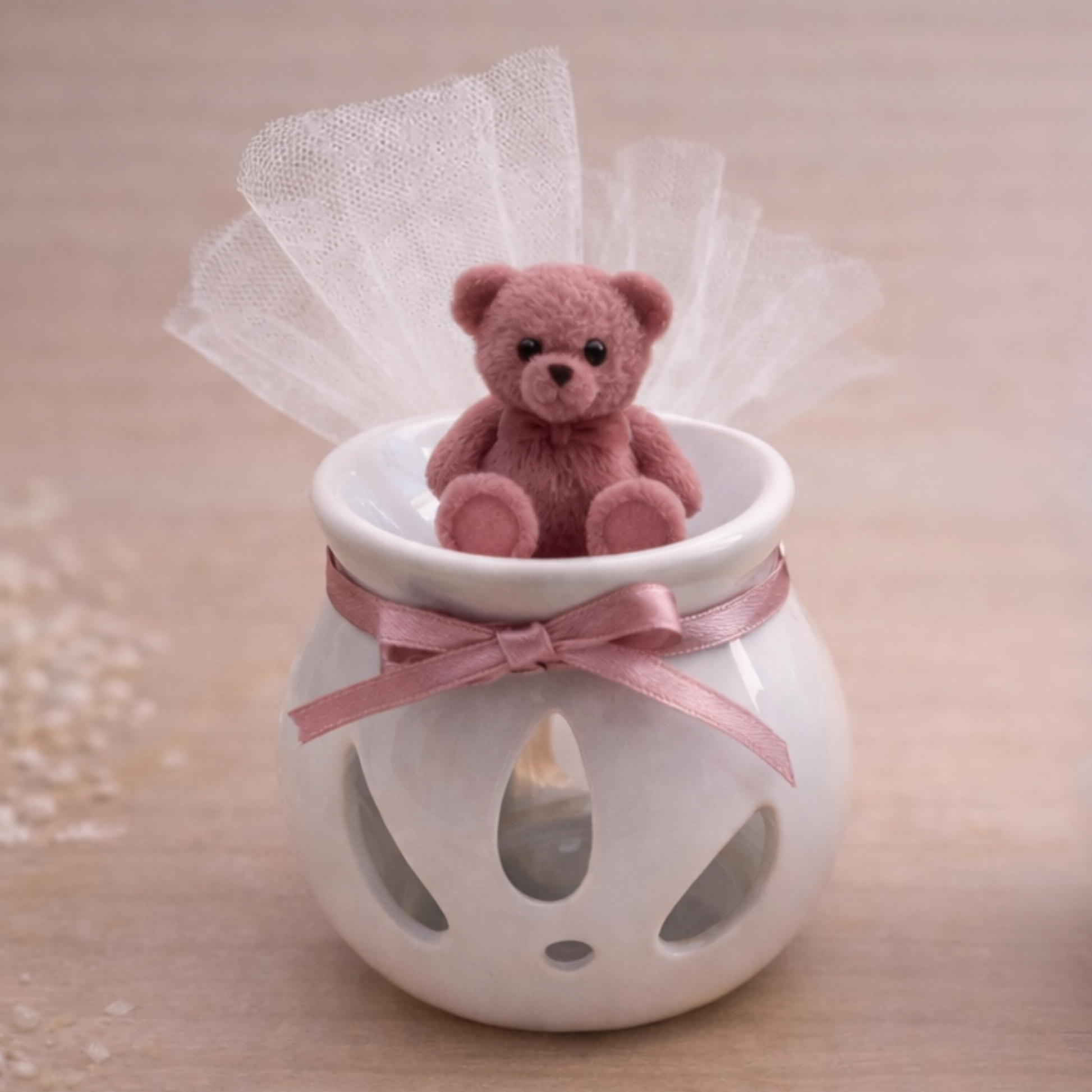 Ο κεραμικός αρωματιστής με αρωματικό mini κερί melts σε σχέδιο αρκουδάκι αποτελεί μια γλυκιά και κομψή επιλογή για μπομπονιέρα βάπτισης ή διακοσμητικό δώρο. Ο συνδυασμός του λευκού κεραμικού αρωματιστή με το χειροποίητο κερί melts δημιουργεί ένα τρυφερό και elegant αποτέλεσμα, ιδανικό για παιδικά και ρομαντικά concept.
