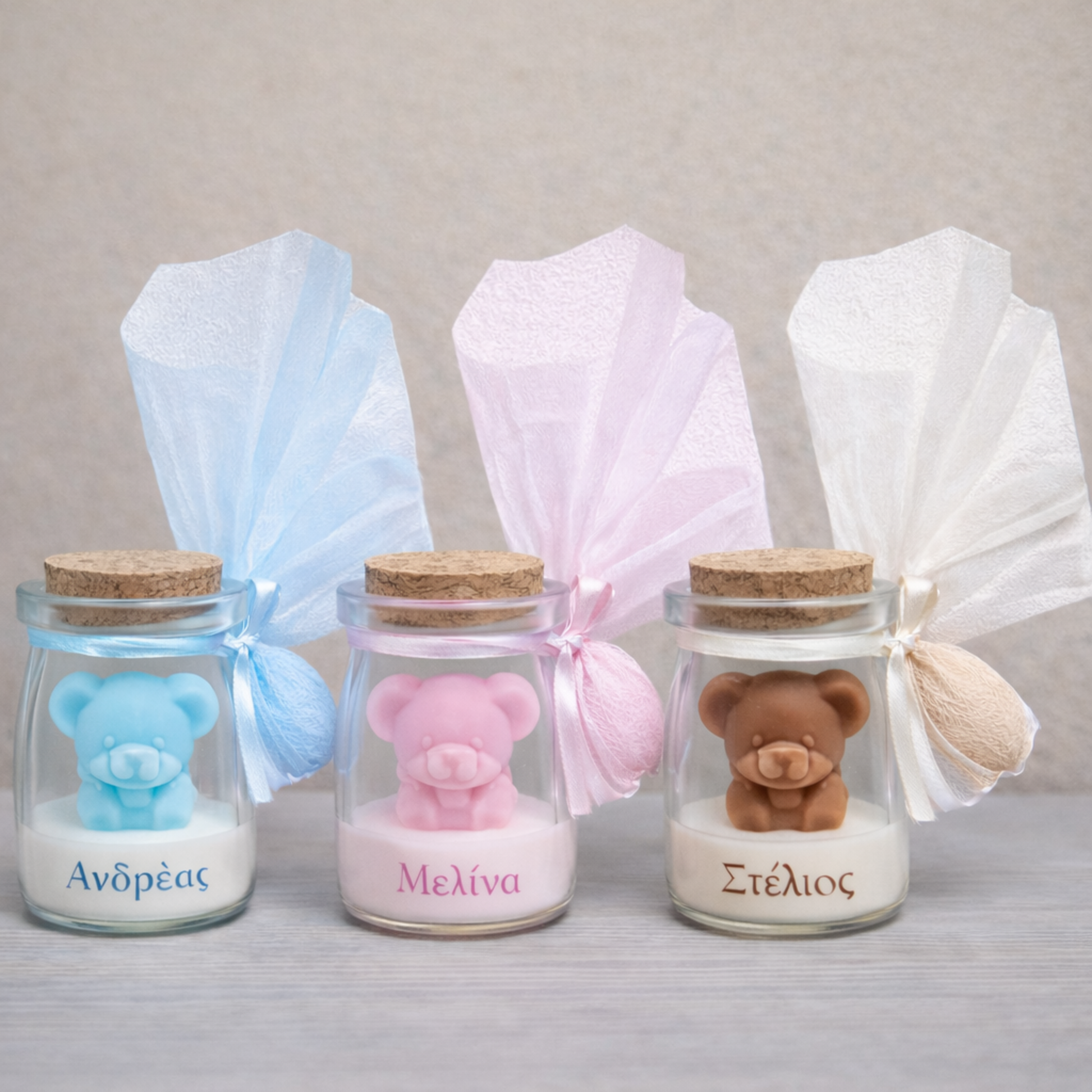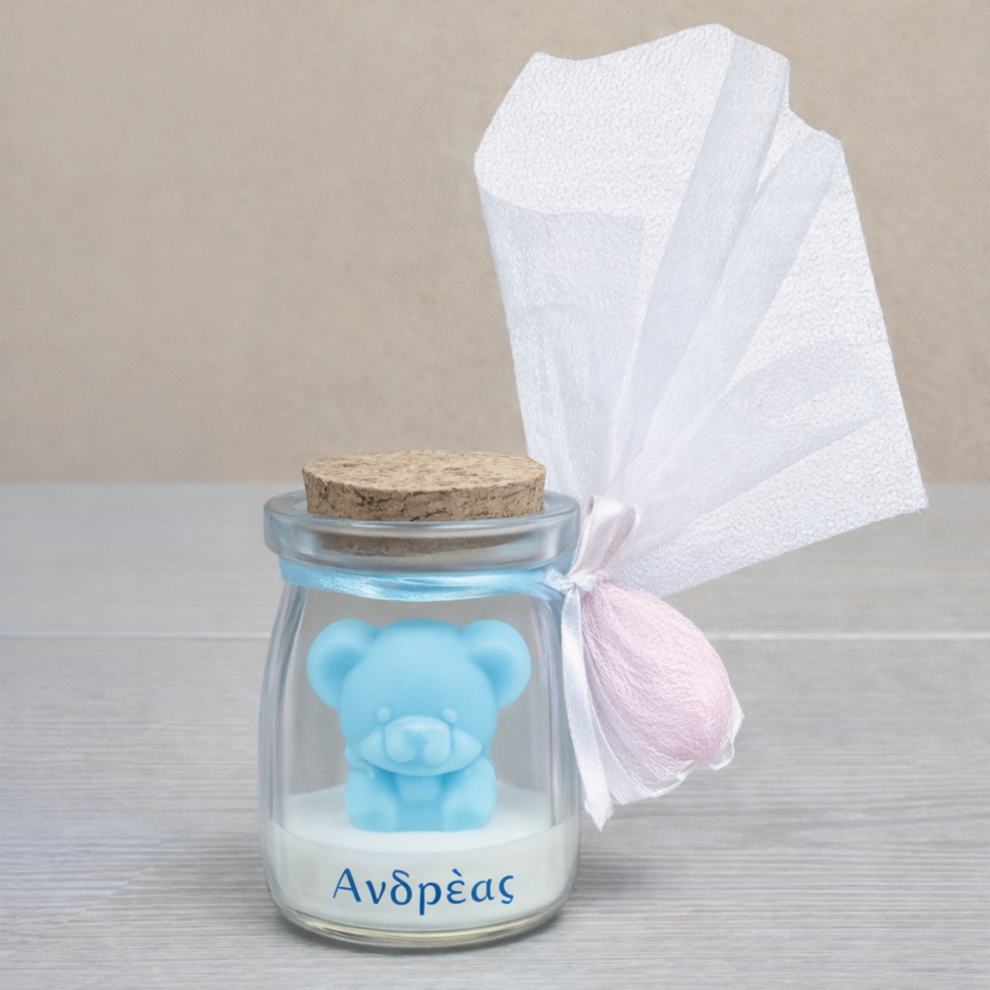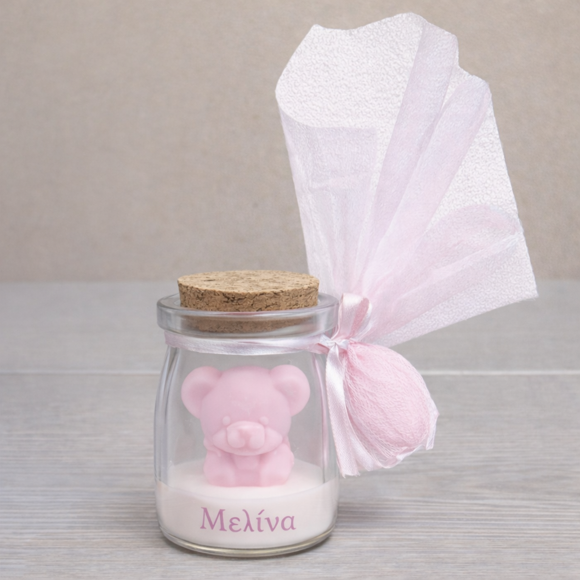Το χαριτωμένο αρκουδάκι τοποθετημένο μέσα σε γυάλινο δοχείο με φελλό δημιουργεί ένα μοναδικό αποτέλεσμα, που μπορεί να διατηρηθεί ως αναμνηστικό διακοσμητικό μετά το μυστήριο.