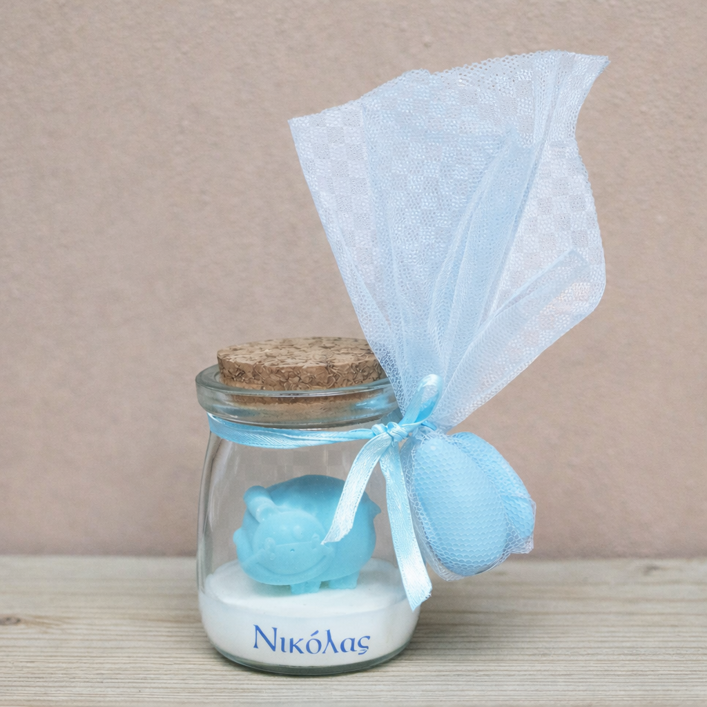 Παιδική μπομπονιέρα Κερί Ζωάκι σε γυάλινο βαζάκι αποτελεί μια κομψή και ιδιαίτερη επιλογή για βάπτιση.