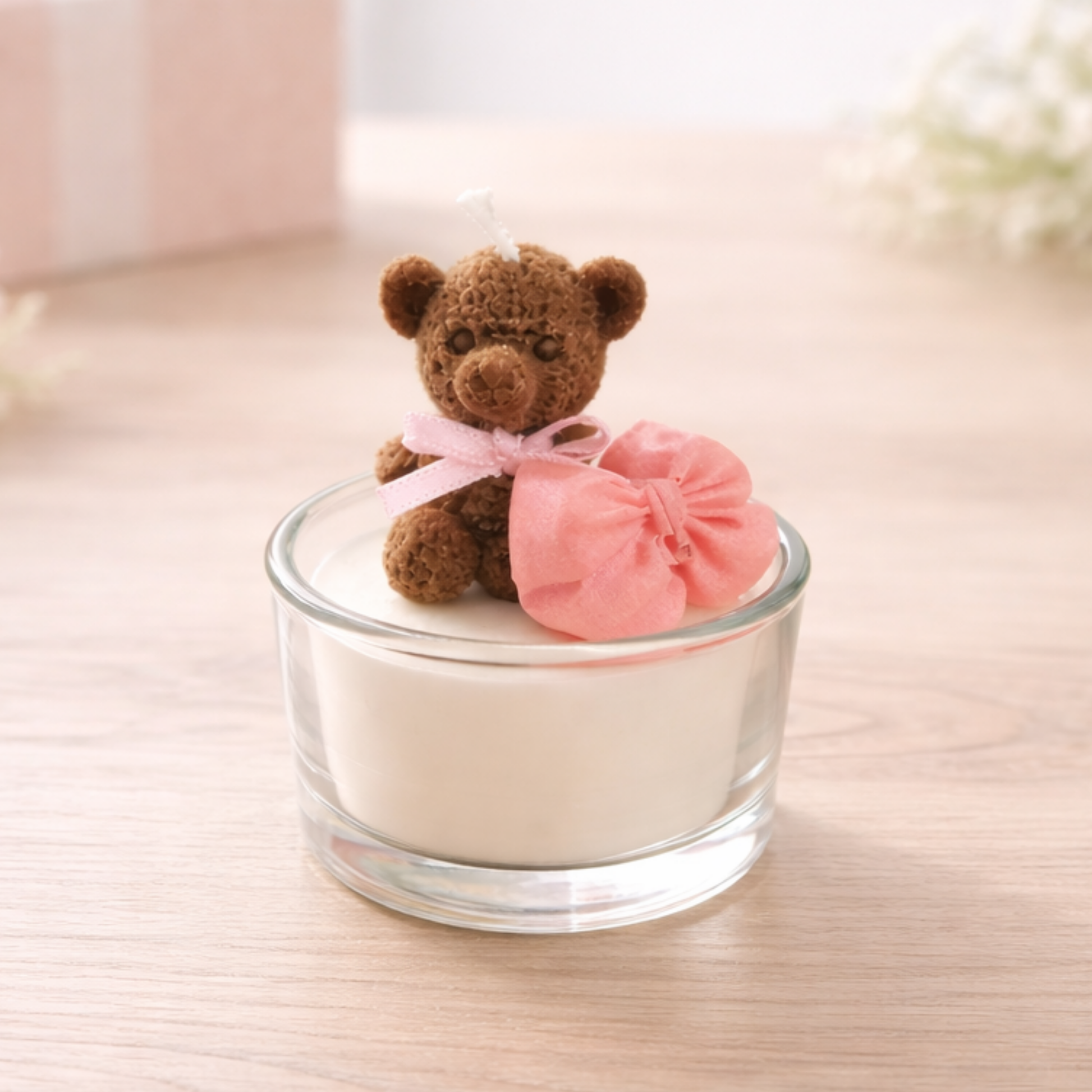 Το χαριτωμένο αρκουδάκι από κερί, τοποθετημένο μέσα σε γυάλινο βαζάκι δεμένο με τούλι, ολοκληρώνεται με αναγραφή ονόματος επάνω στο γυαλί, δημιουργώντας ένα ιδιαίτερο και διαχρονικό αναμνηστικό διακοσμητικό μετά το μυστήριο.