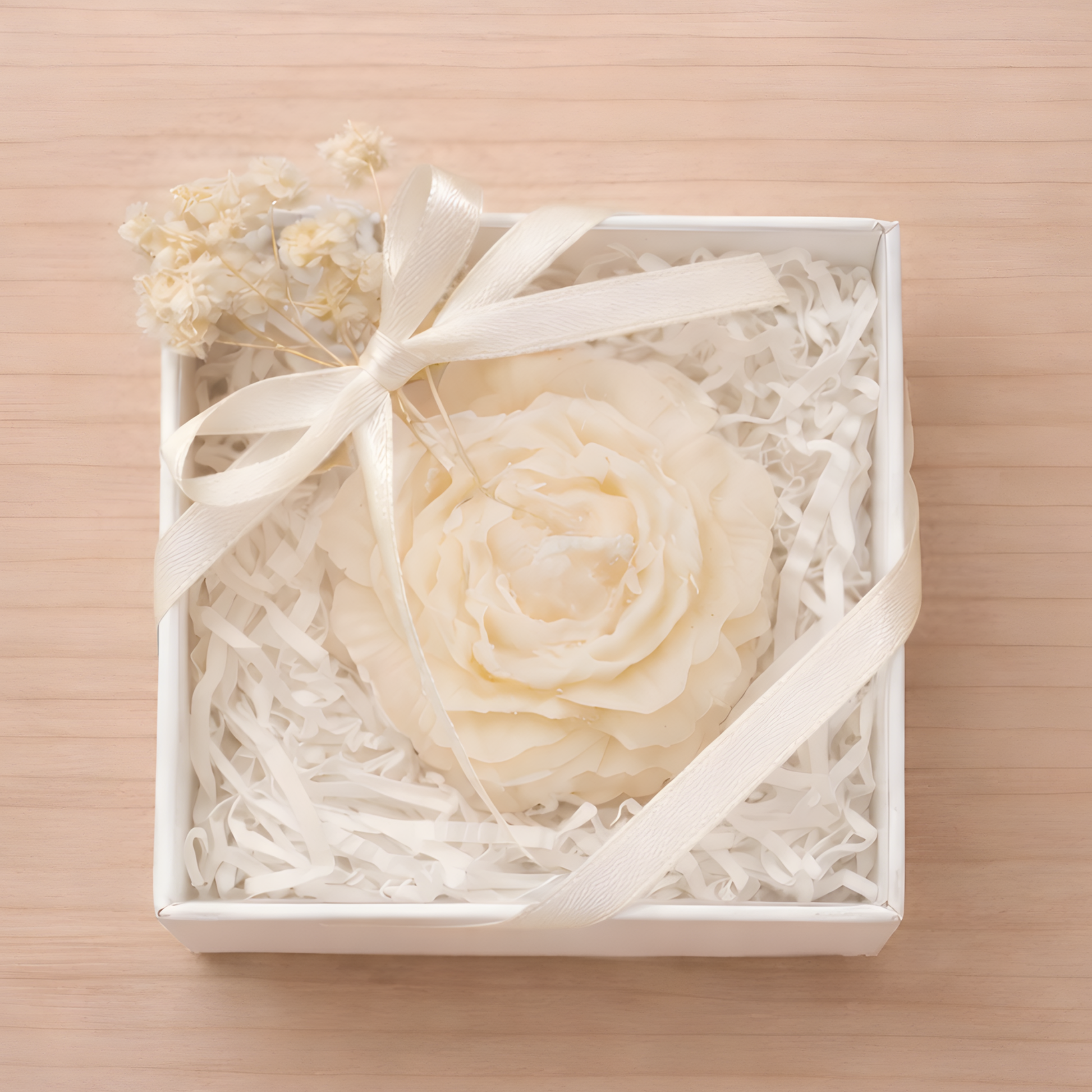 Η λεπτομερής παιώνια από κερί, τοποθετημένη σε λευκό κουτί δώρου με διακοσμητικό χαρτί και δεμένη με κορδέλα, δημιουργεί ένα εκλεπτυσμένο αποτέλεσμα που αποπνέει φρεσκάδα και διαχρονική αισθητική.