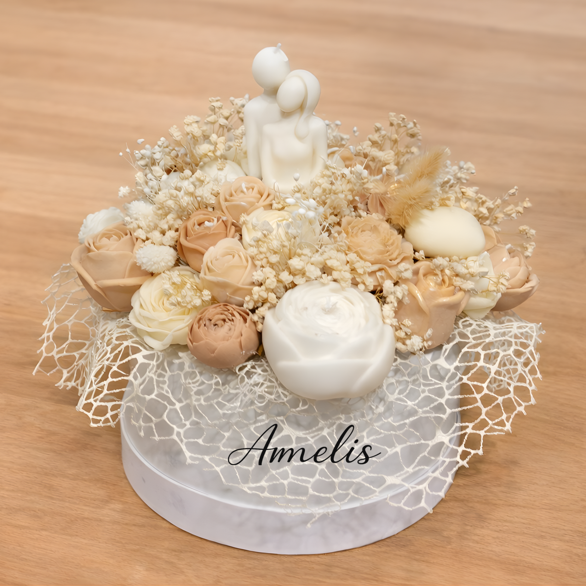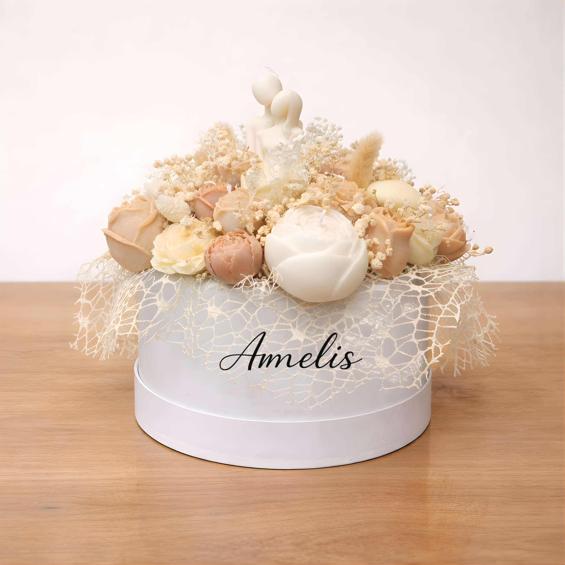 Η σύνθεση περιλαμβάνει χειροποίητα κερινά λουλούδια σε αρμονικούς τόνους και κεντρικό κερινό στοιχείο ζευγαριού, τοποθετημένα σε κομψό κουτί.
