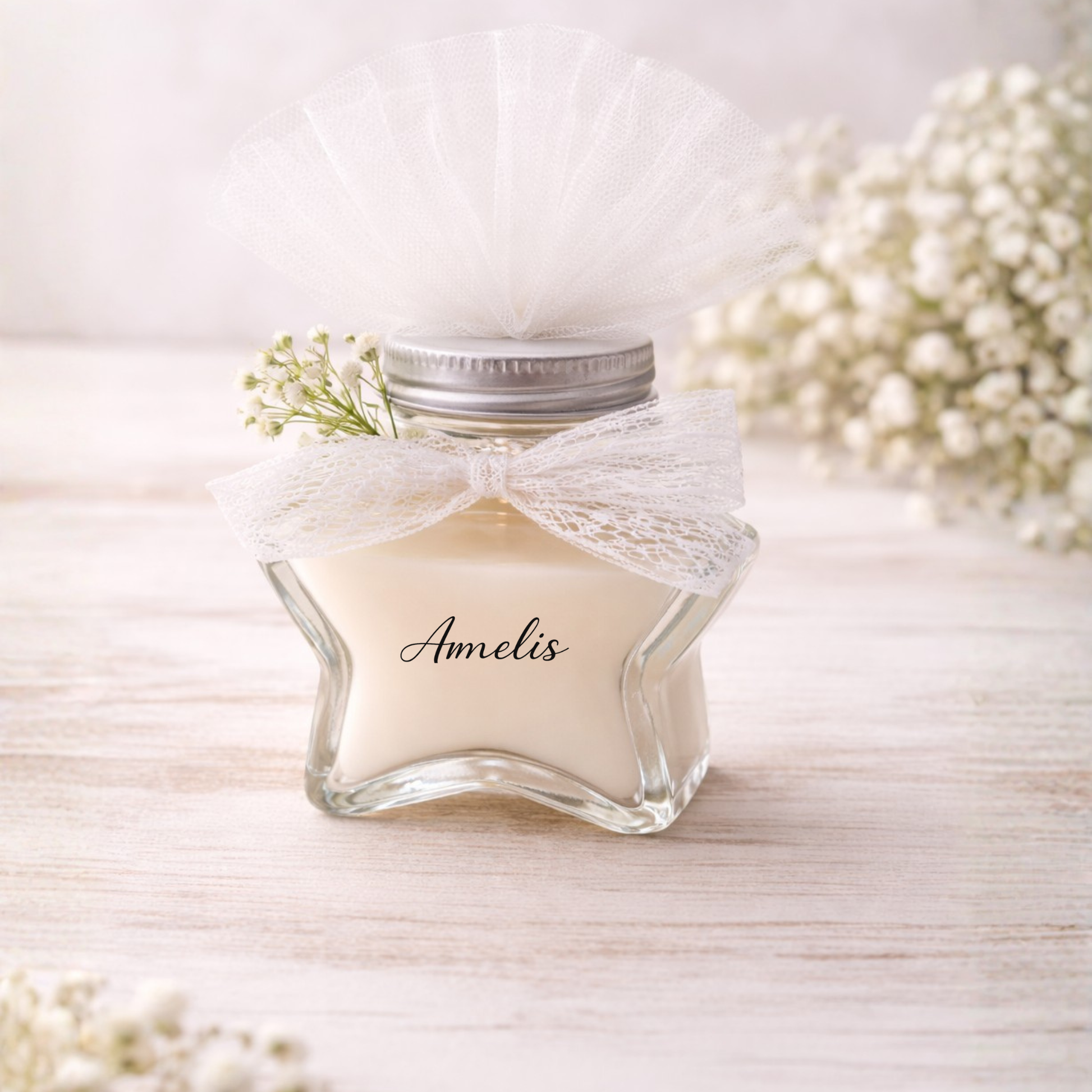 Η μπομπονιέρα με γυάλινο βαζάκι και κερί σε σχήμα αστεριού είναι μια ζεστή και ιδιαίτερη επιλογή που προσφέρει ατμόσφαιρα και διακριτική πολυτέλεια. Το αστέρι ως θέμα ταιριάζει εύκολα τόσο σε βάπτιση κοριτσιού όσο και σε γάμο, ενώ το βαζάκι μένει μετά ως χρηστικό αντικείμενο και αναμνηστικό. Η σύνθεση ολοκληρώνεται με προσεγμένο δέσιμο, ώστε να δείχνει elegant και έτοιμη για το τραπέζι ή το welcome set.