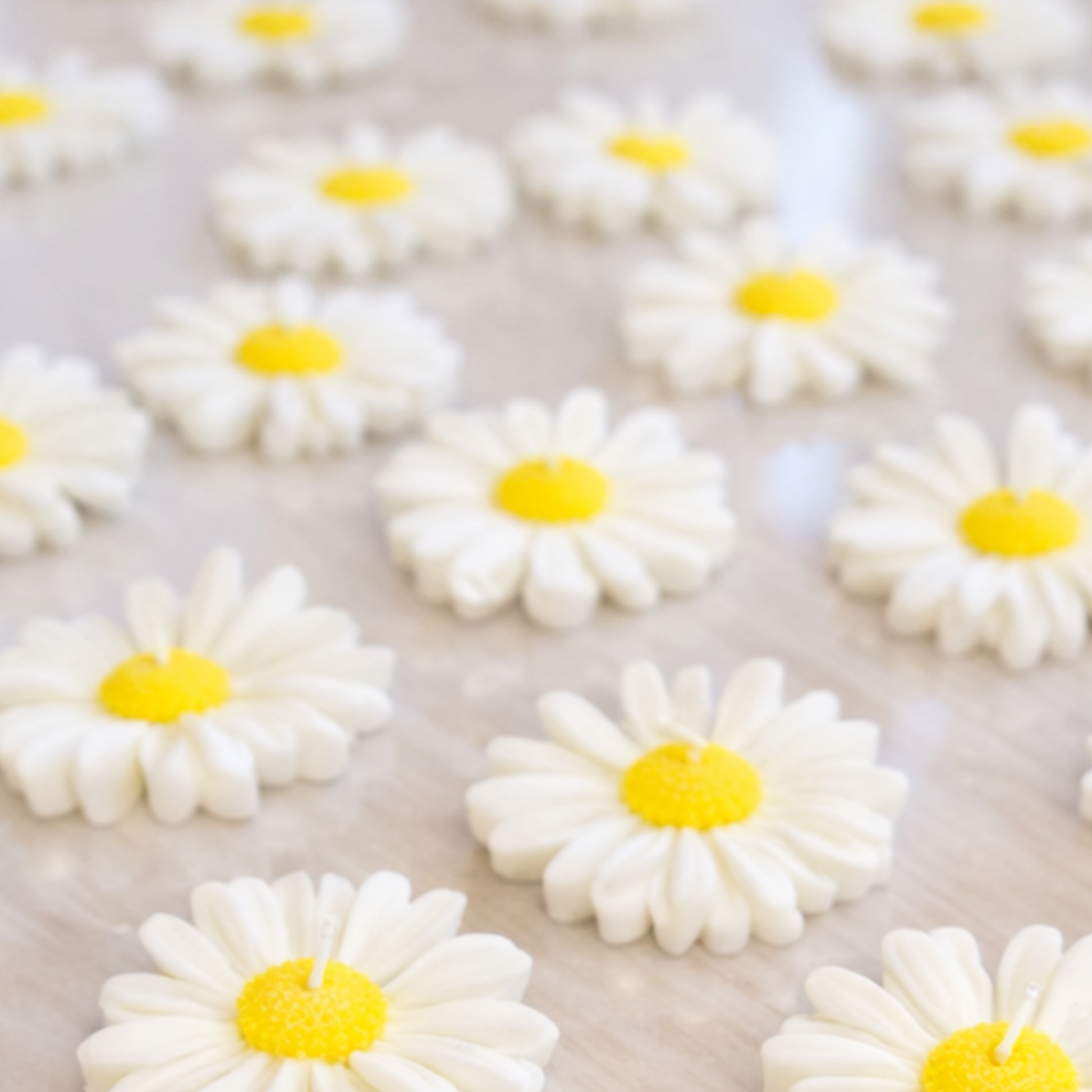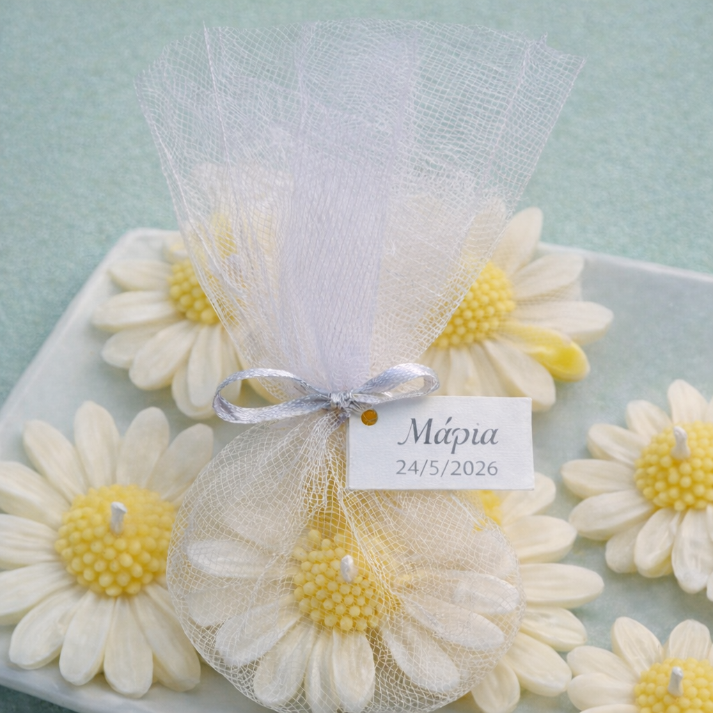 Το κερί σε σχήμα μαργαρίτας ξεχωρίζει για τις λεπτομέρειες στα πέταλα και το ζωηρό κέντρο, προσφέροντας ένα κομψό και χαρούμενο αναμνηστικό που μπορεί να χρησιμοποιηθεί και ως διακοσμητικό μετά το μυστήριο.