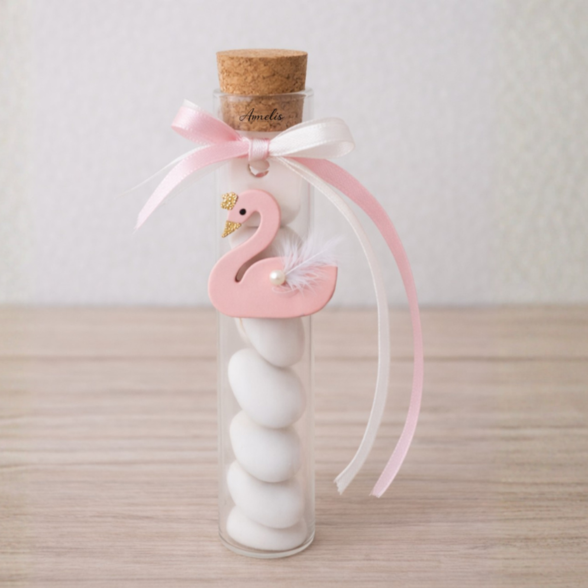 Ο διάφανος γυάλινος σωλήνας γεμίζει με λευκά κουφέτα και διακοσμείται με κερί σε σχέδιο κύκνου, δημιουργώντας ένα φίνο και τρυφερό αποτέλεσμα. Το σύνολο ολοκληρώνεται με φελλό και δέσιμο από σατέν κορδέλα σε ροζ ή λευκή απόχρωση, προσφέροντας ένα καλαίσθητο αναμνηστικό που μπορεί να διατηρηθεί και μετά το μυστήριο.