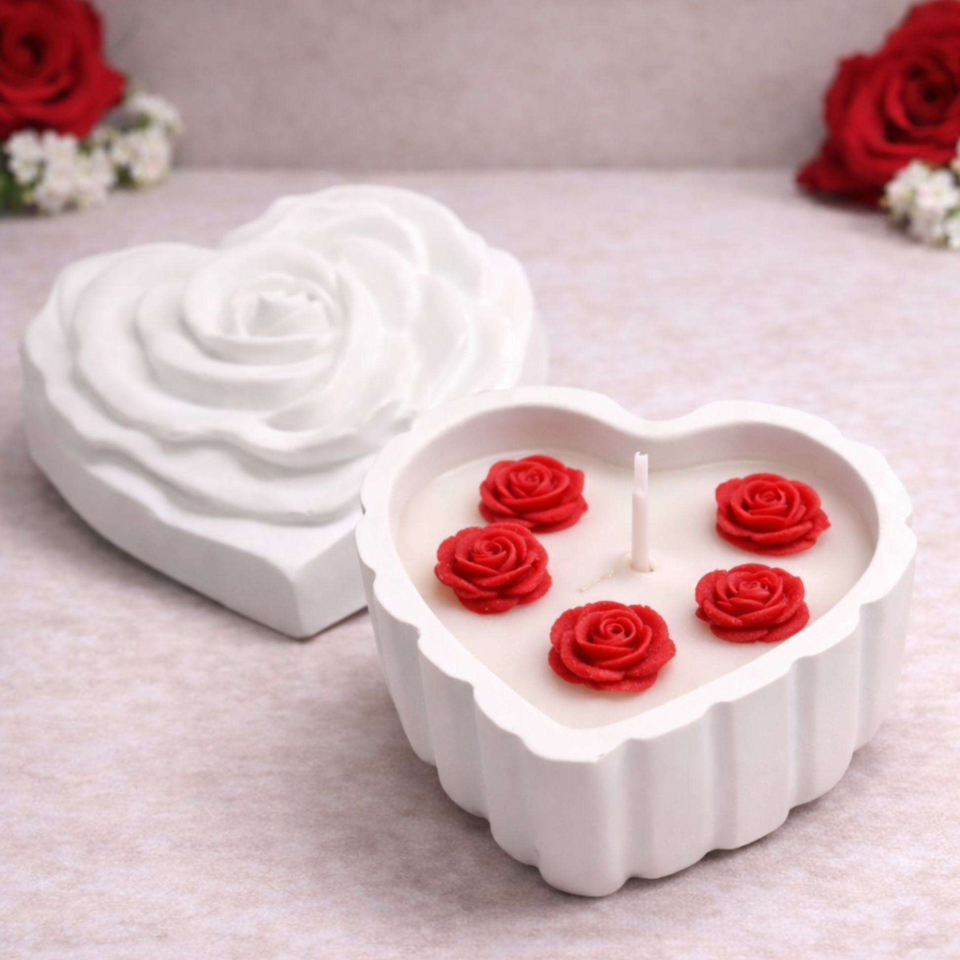 Ρομαντική πορσελάνινη καρδιά με καπάκι σε σχέδιο τριαντάφυλλο, γεμισμένη με χειροποίητο αρωματικό κερί και διακοσμητικά μικρά κεριά σε σχήμα τριαντάφυλλου.