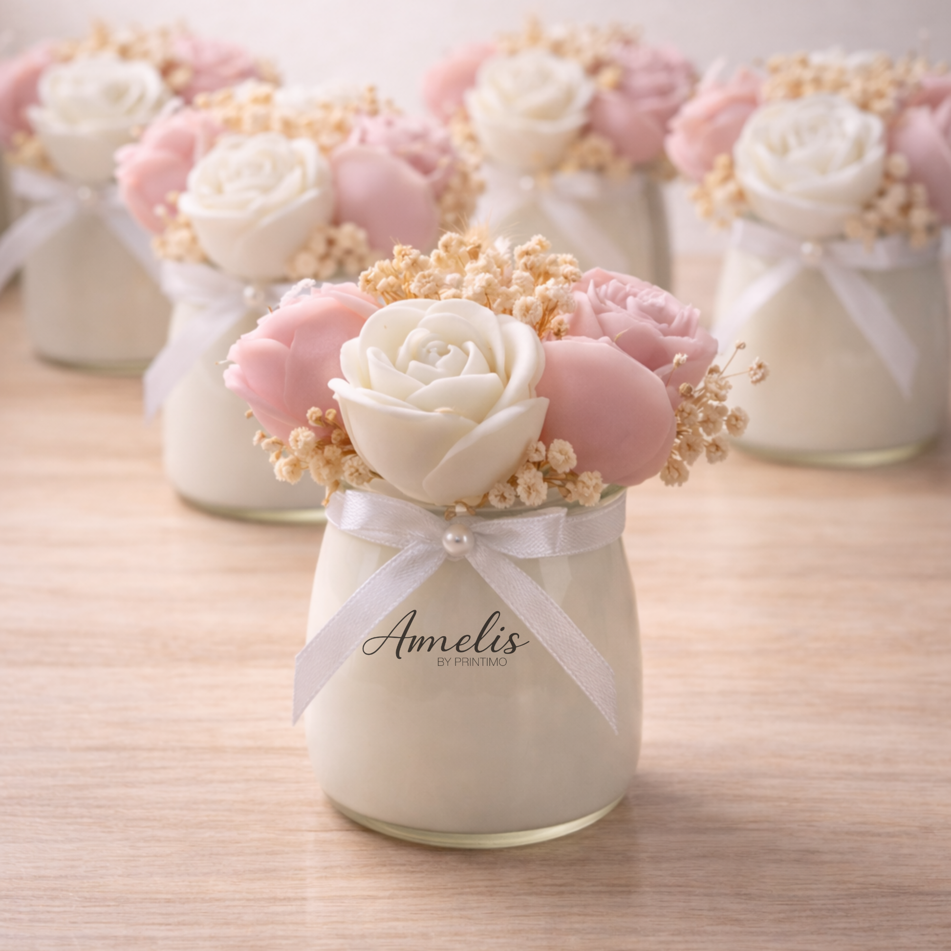 Οι απαλές παστέλ αποχρώσεις δημιουργούν μια τρυφερή και elegant αισθητική, ενώ το αρωματικό κερί χαρίζει ζεστή ατμόσφαιρα στον χώρο.