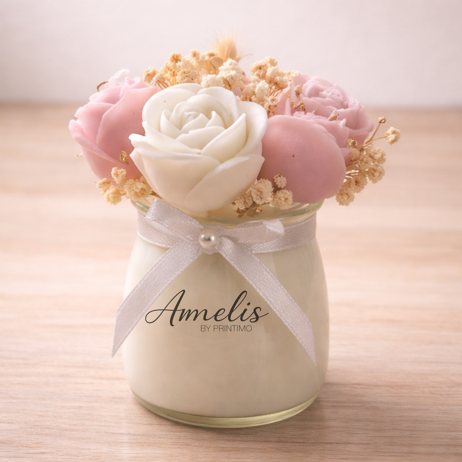 Ένα κομψό χειροποίητο κερί με ροζ και λευκά τριαντάφυλλα, τοποθετημένο σε γυάλινο βαζάκι με διακριτική κορδέλα. Ιδανική επιλογή για δώρο Αγίου Βαλεντίνου, επετείους ή κάθε ρομαντική περίσταση.