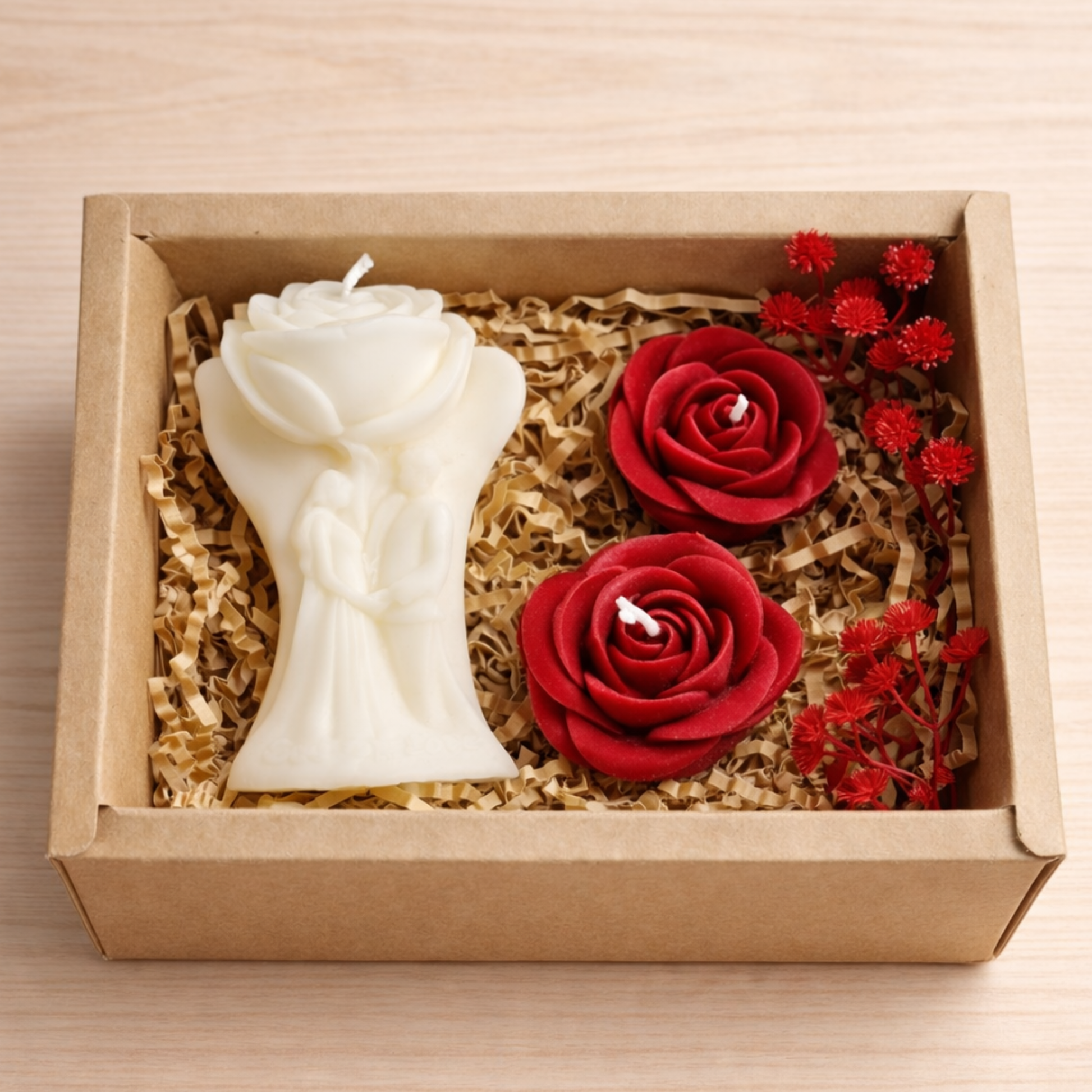 Το σετ συνδυάζει ένα ιδιαίτερο κερί ζευγαριού με ανάγλυφο λουλούδι και δύο εντυπωσιακά κεριά τριαντάφυλλο, τοποθετημένα σε κομψό κουτί δώρου με φυσικό γέμισμα και διακοσμητικές λεπτομέρειες.